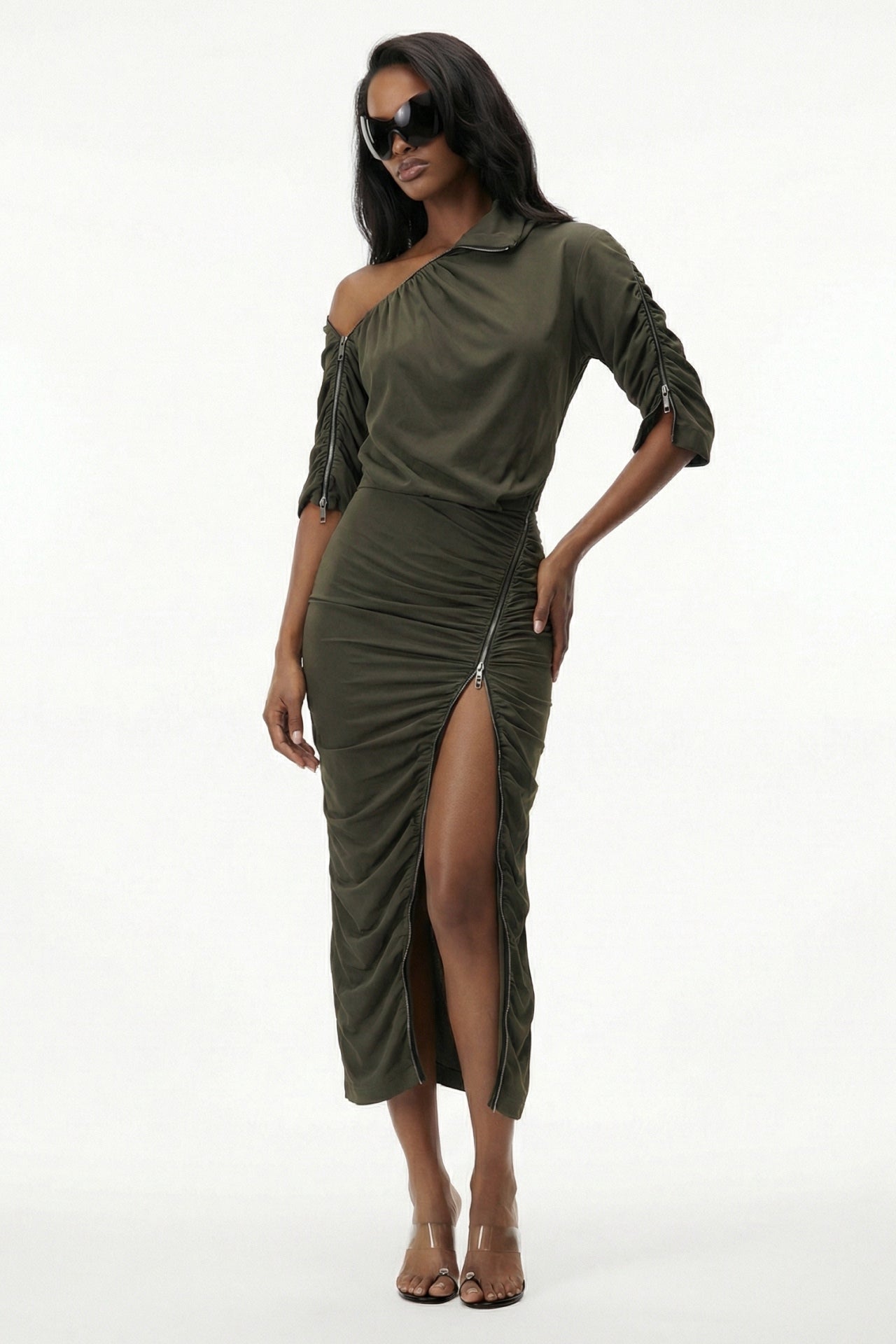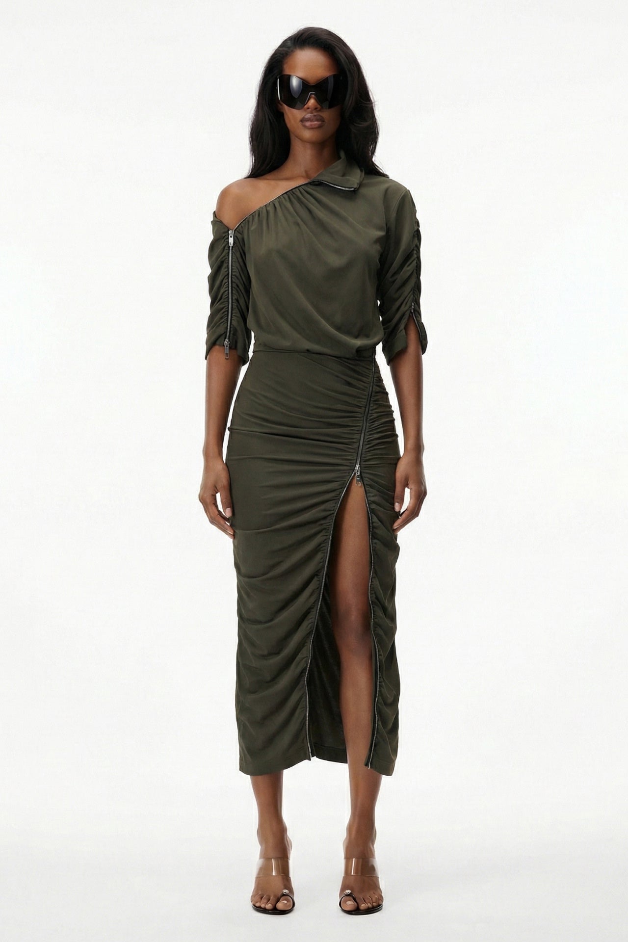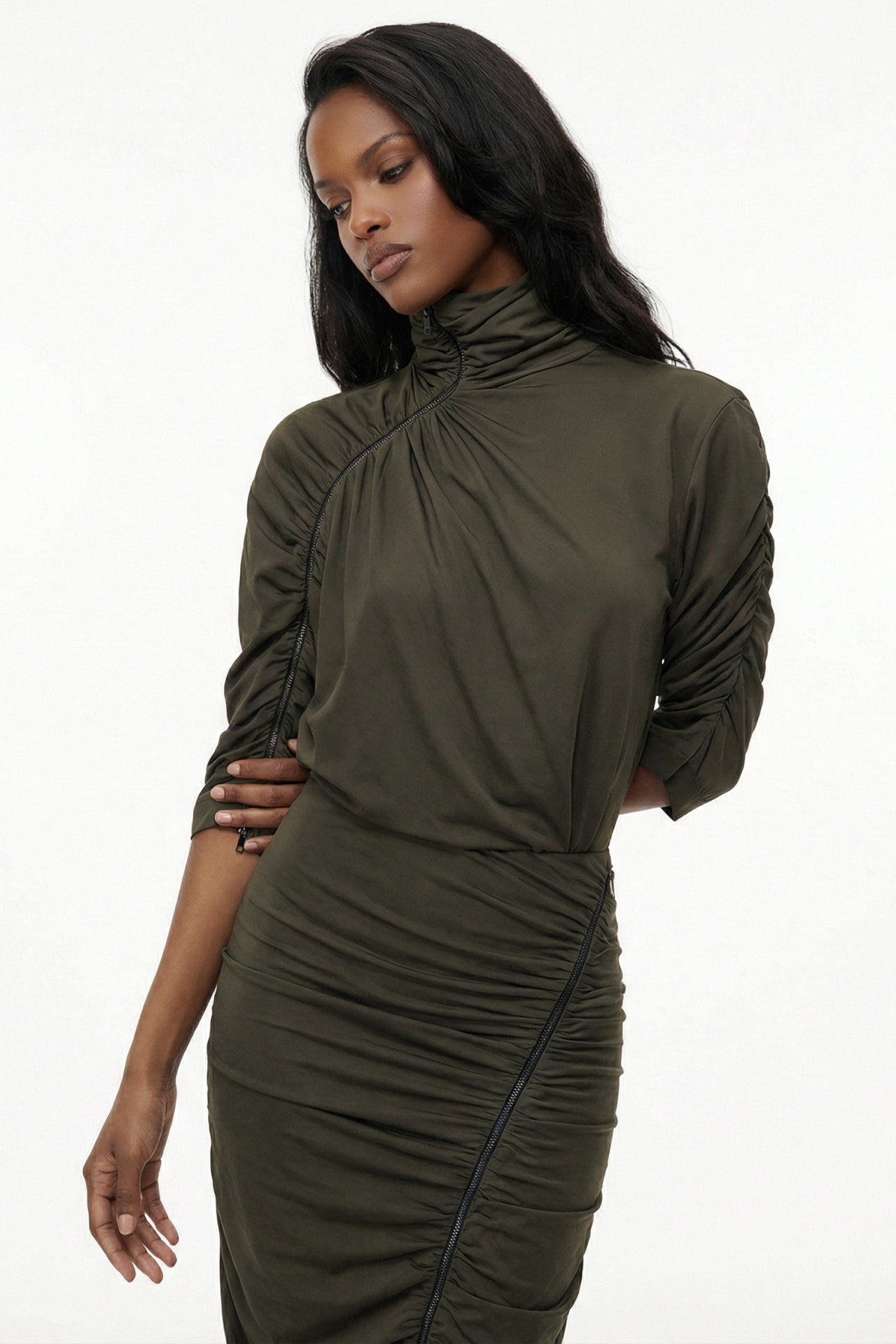 Details of the front, sleeves, and skirt are asymmetrically draped