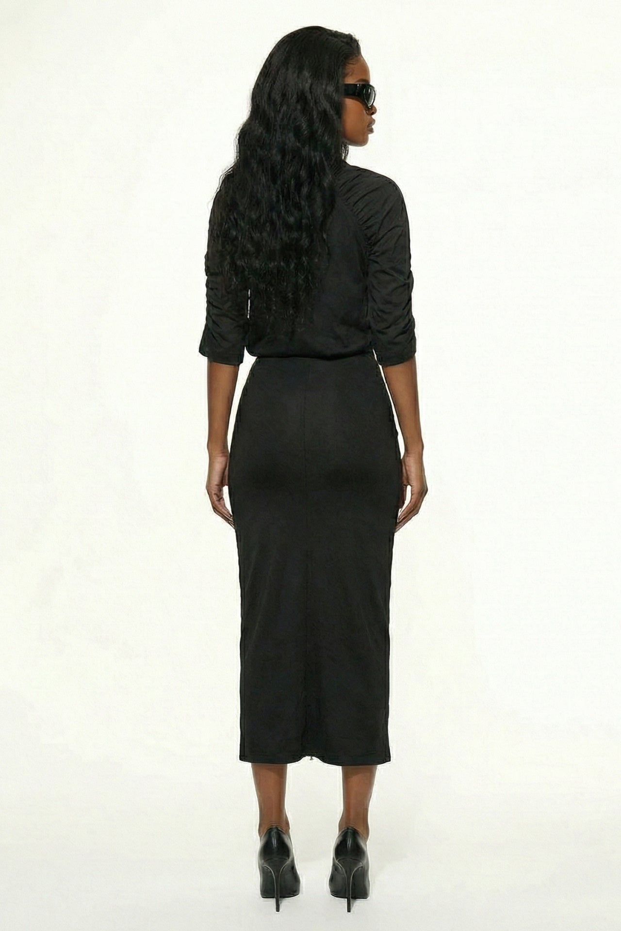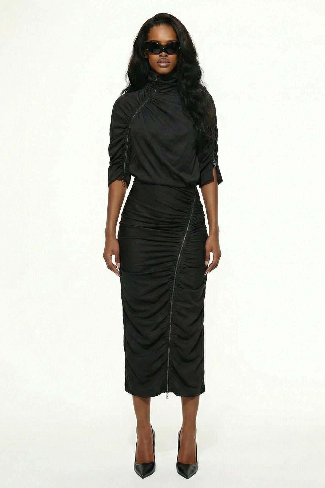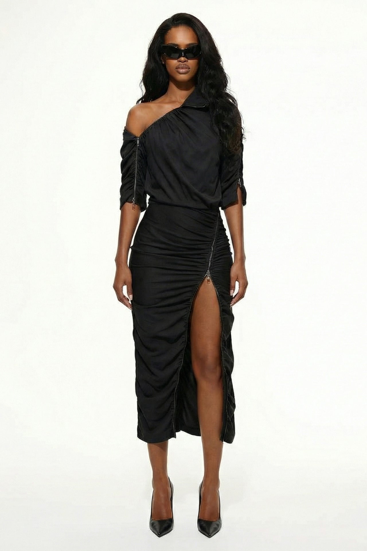 Asymmetrical draping details on the front, sleeves, and skirt.