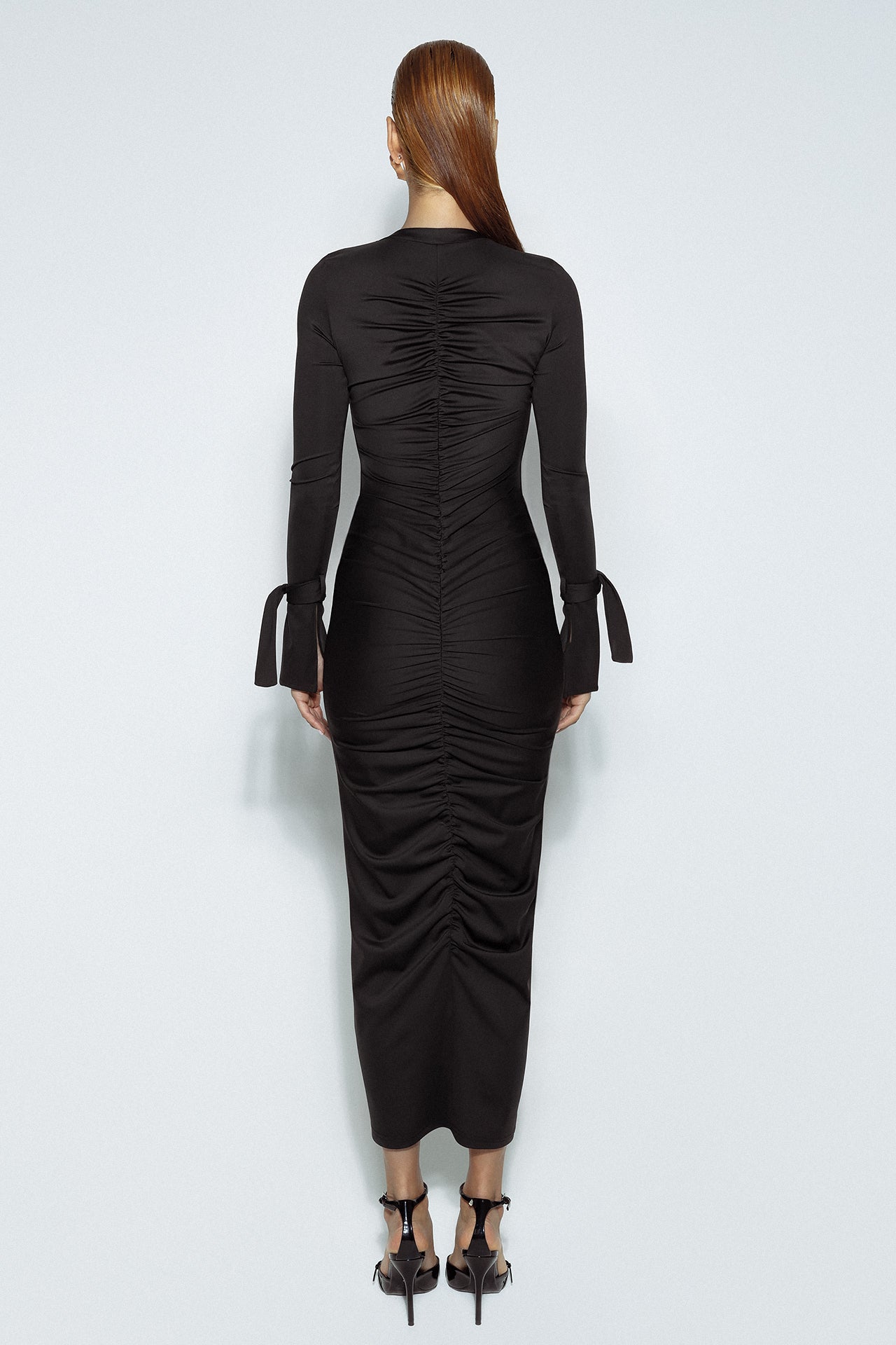 Model's measurements: Bust 84 cm / 33 in, Waist 66 cm / 26 in, Hips 95 cm / 37.5 in, Height 177 cm / 5'10". The model is wearing size XS