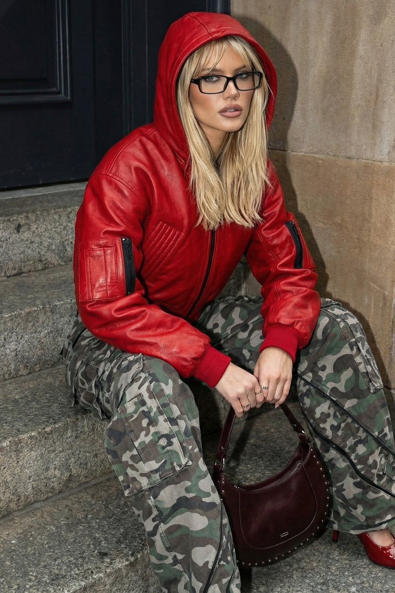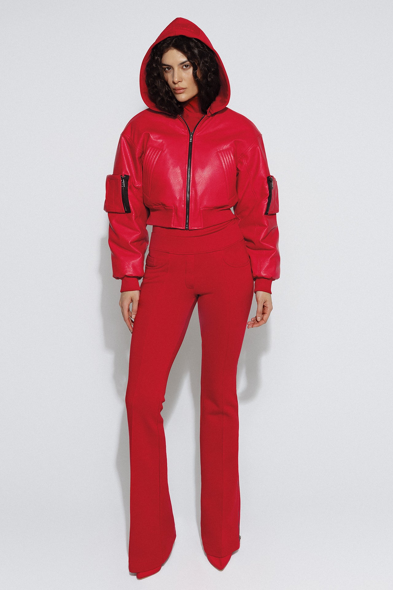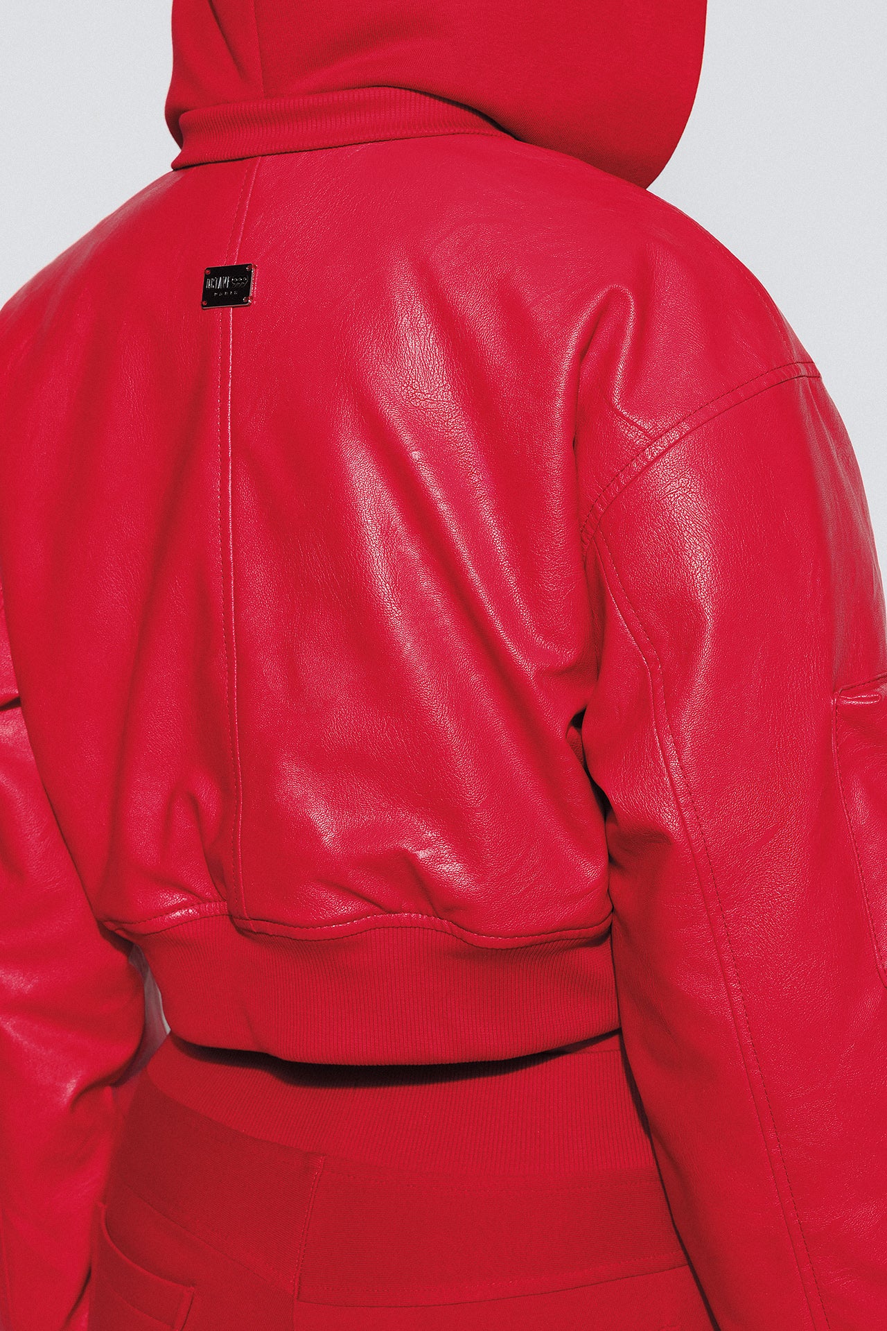 Dense textured eco-leather holds its shape and accentuates the silhouette, creating a striking look.