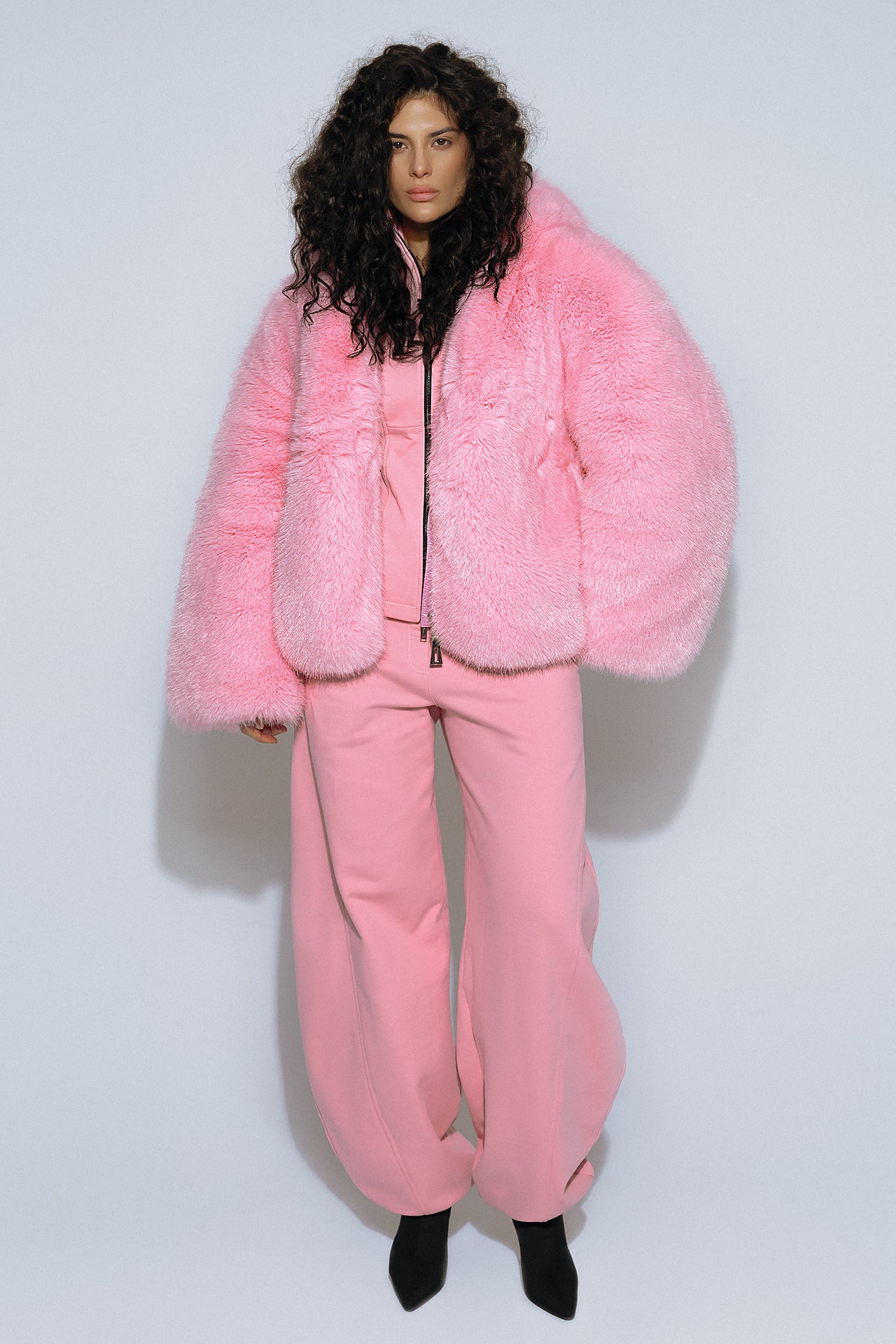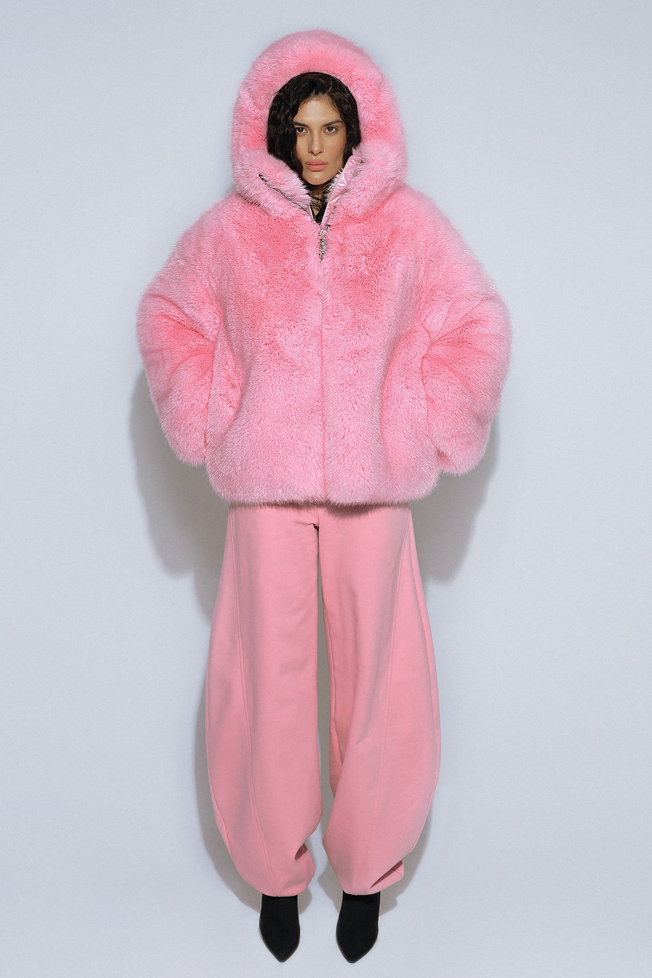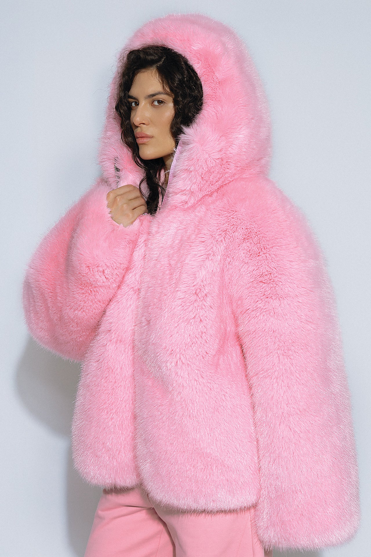 French eco-fur with a deep, complex texture creates a striking silhouette.