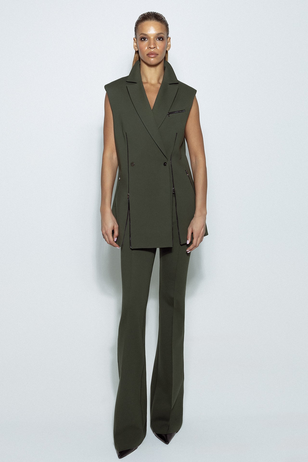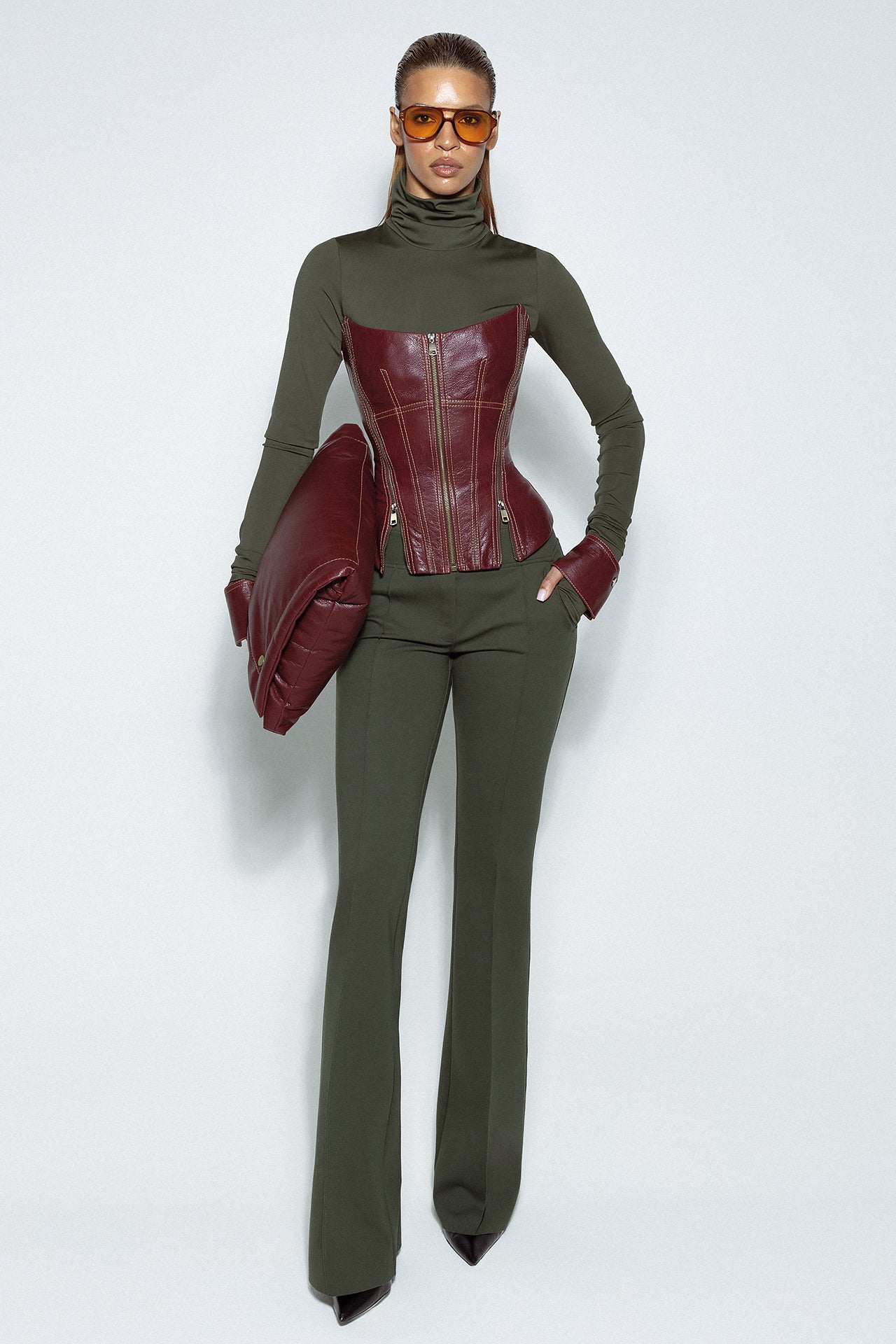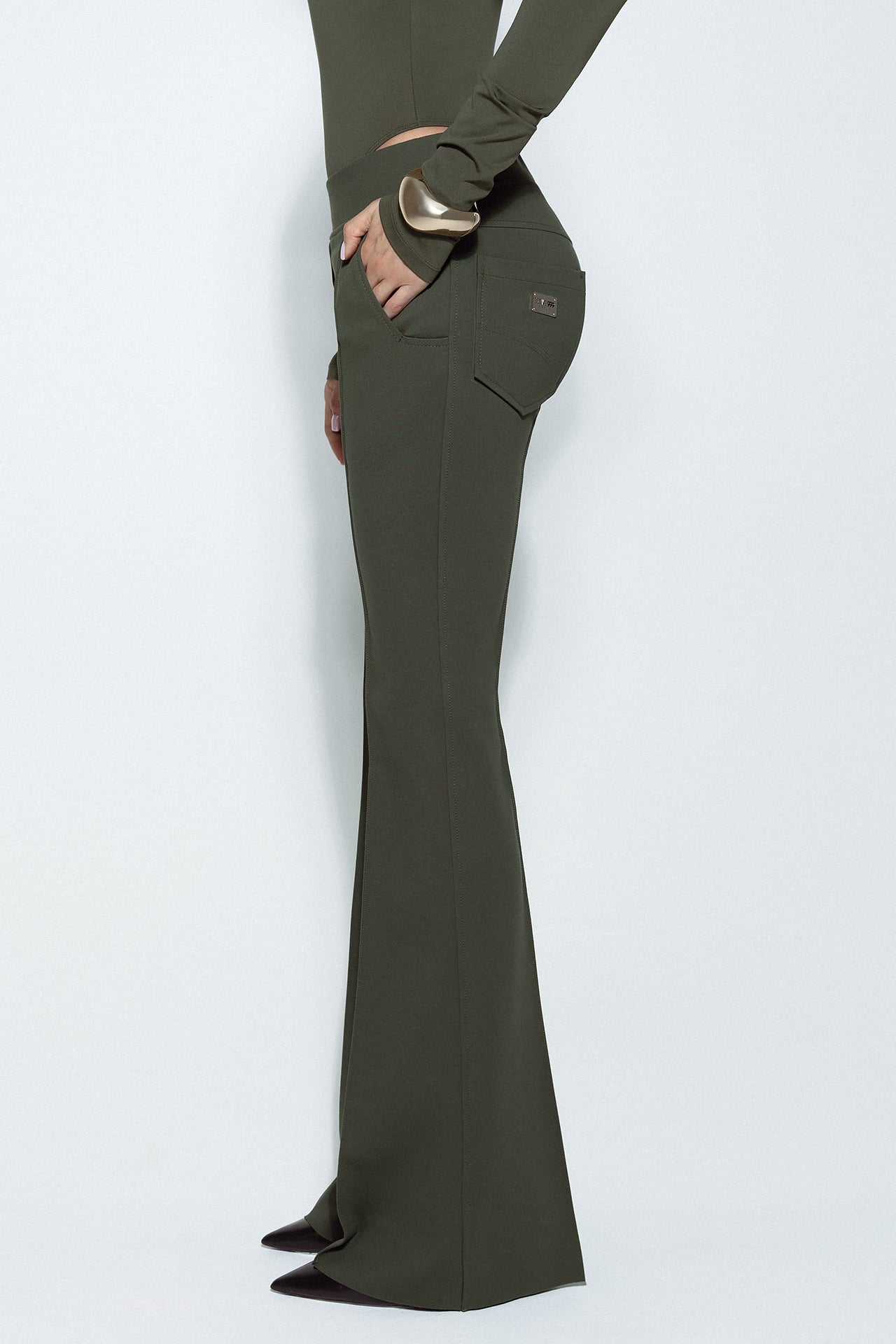 Decorative topstitching along the front and back creases, seam lines, and pockets