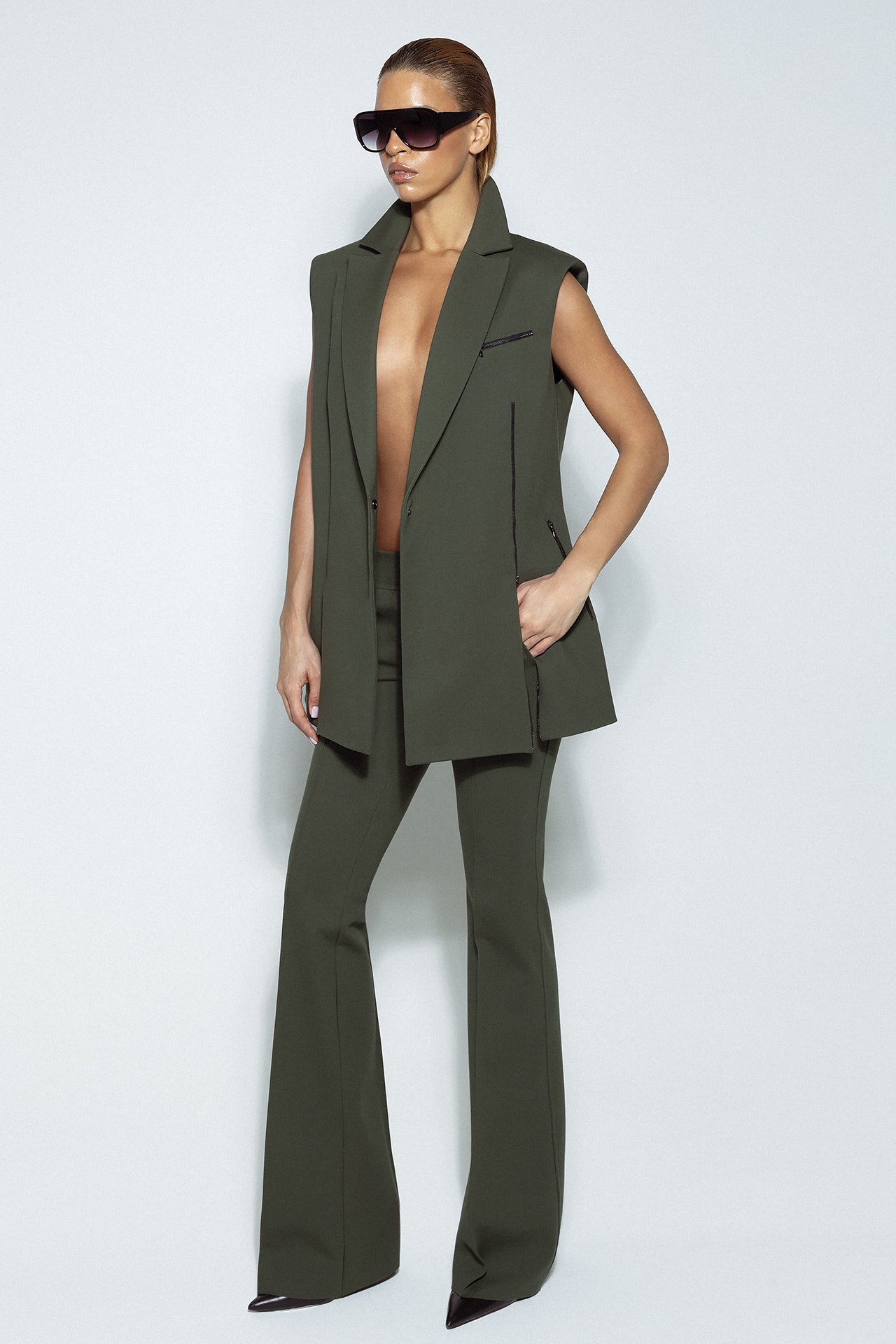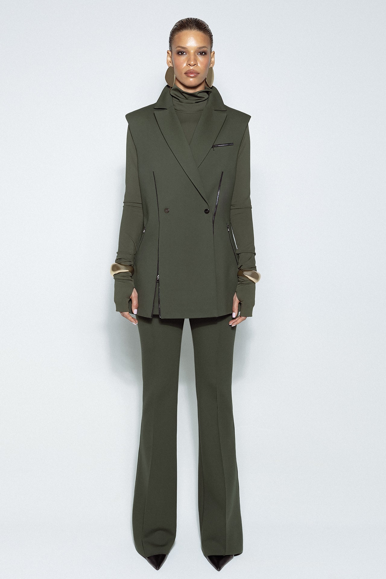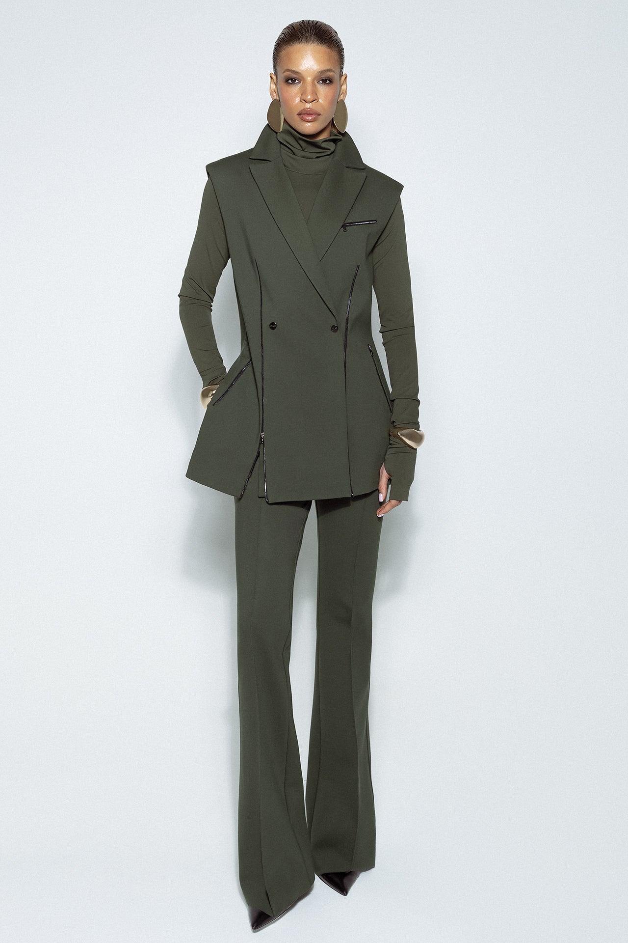 Decorative topstitching along the front and back creases, seam lines, and pockets