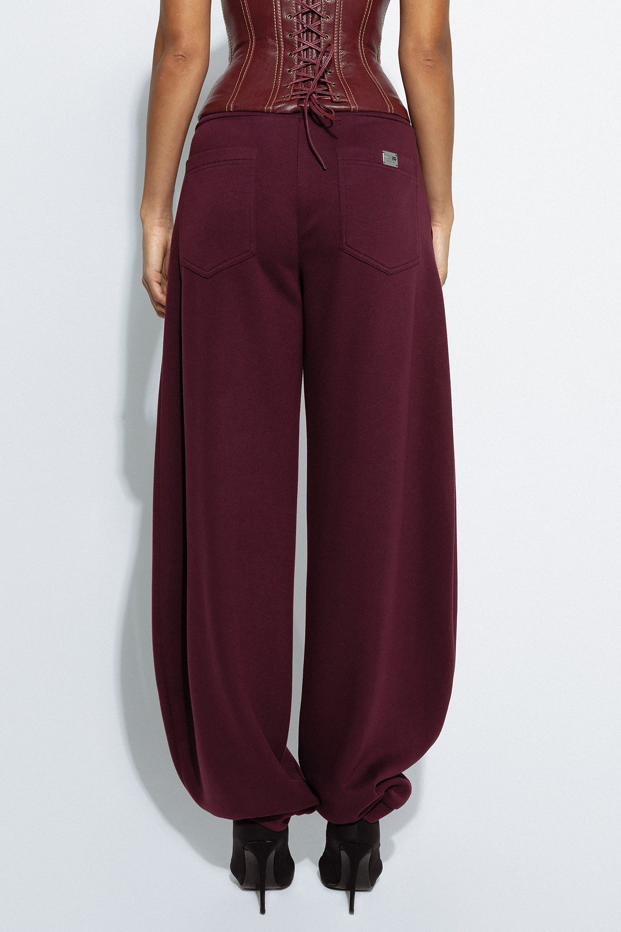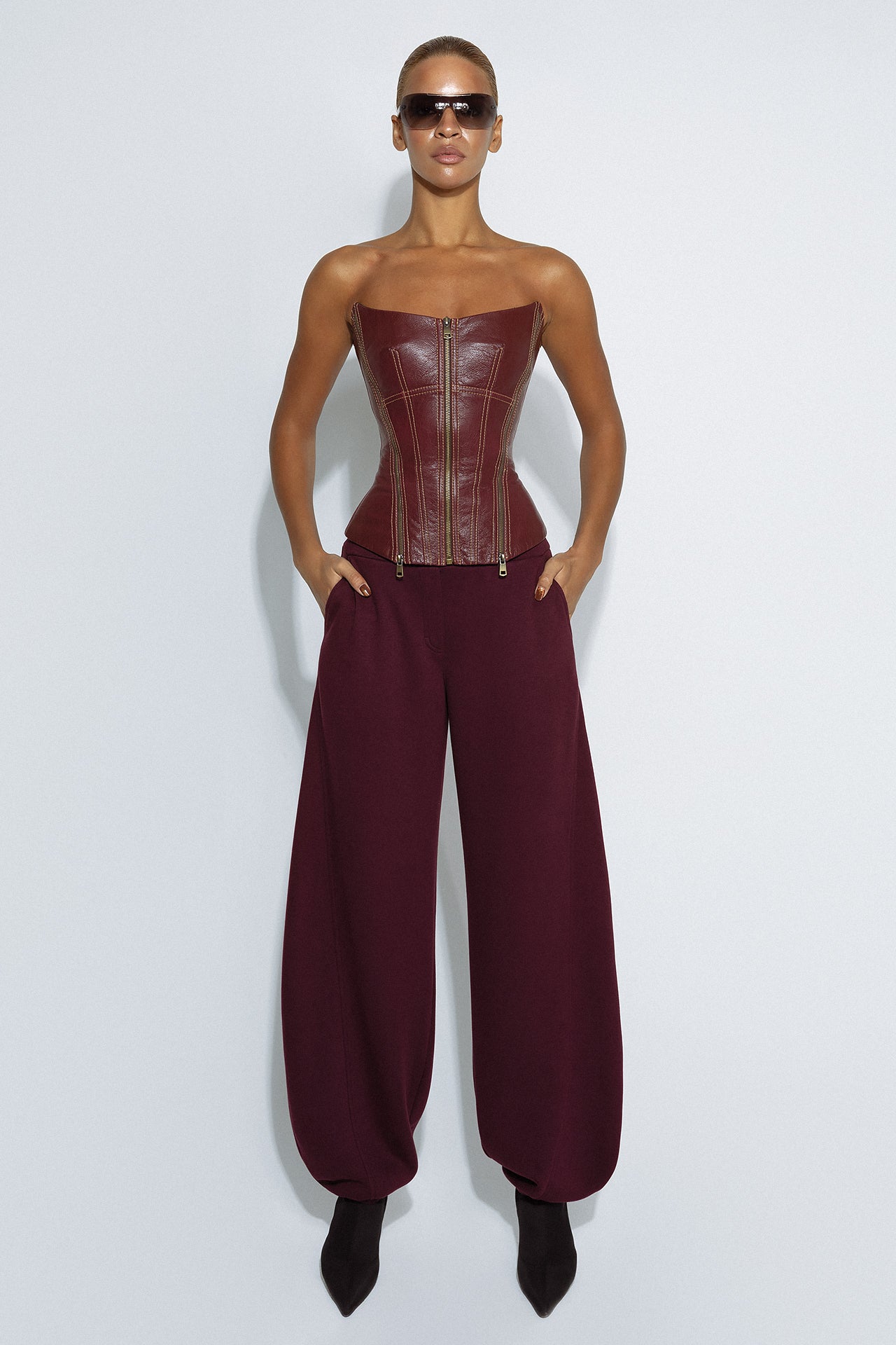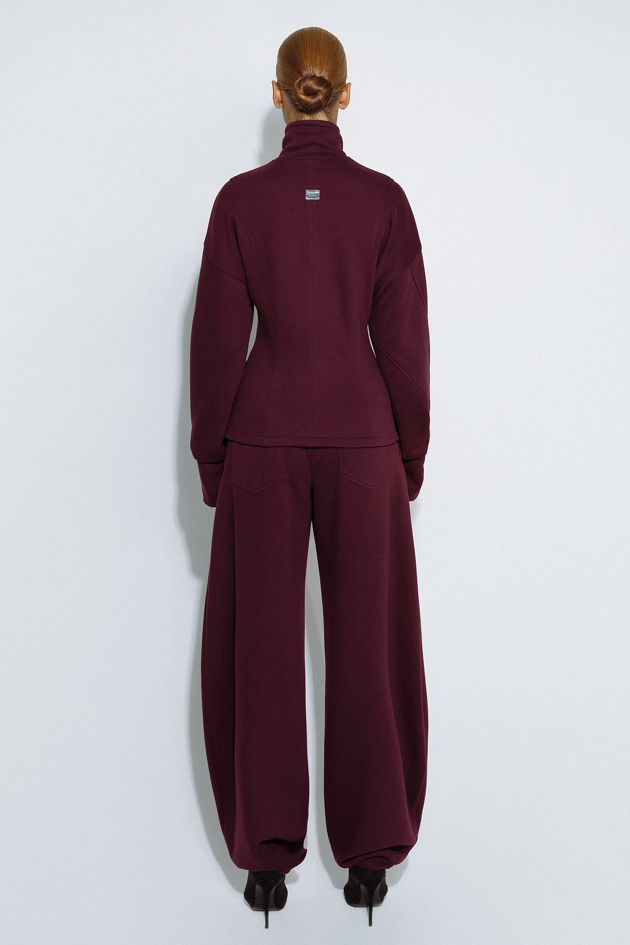 Sculpted silhouette with a rounded hip line, gentle flare, and a tapered leg towards the hem.